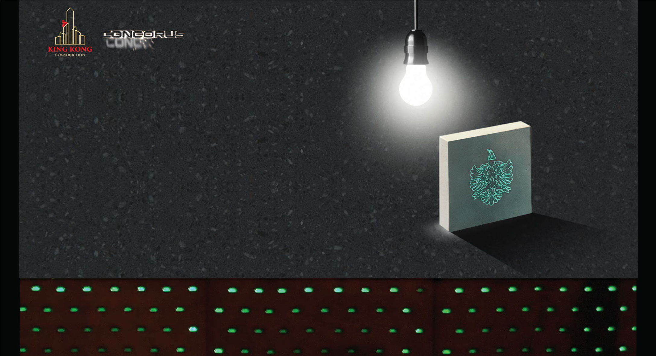 KING KONG’s light transmitting concrete, CONCORUS, is based on the fusion of three main components - concrete, 3D printed sustainable plastic and light. When artificial or natural light hits the sustainable plastic, light is transmitted through the concrete’s surface, making it glow to life.