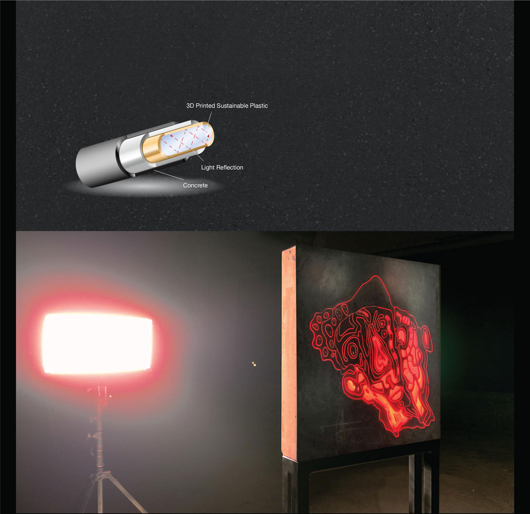 KING KONG’s light transmitting concrete, CONCORUS, is based on the fusion of three main components - concrete, 3D printed sustainable plastic and light. When artificial or natural light hits the sustainable plastic, light is transmitted through the concrete’s surface, making it glow to life.