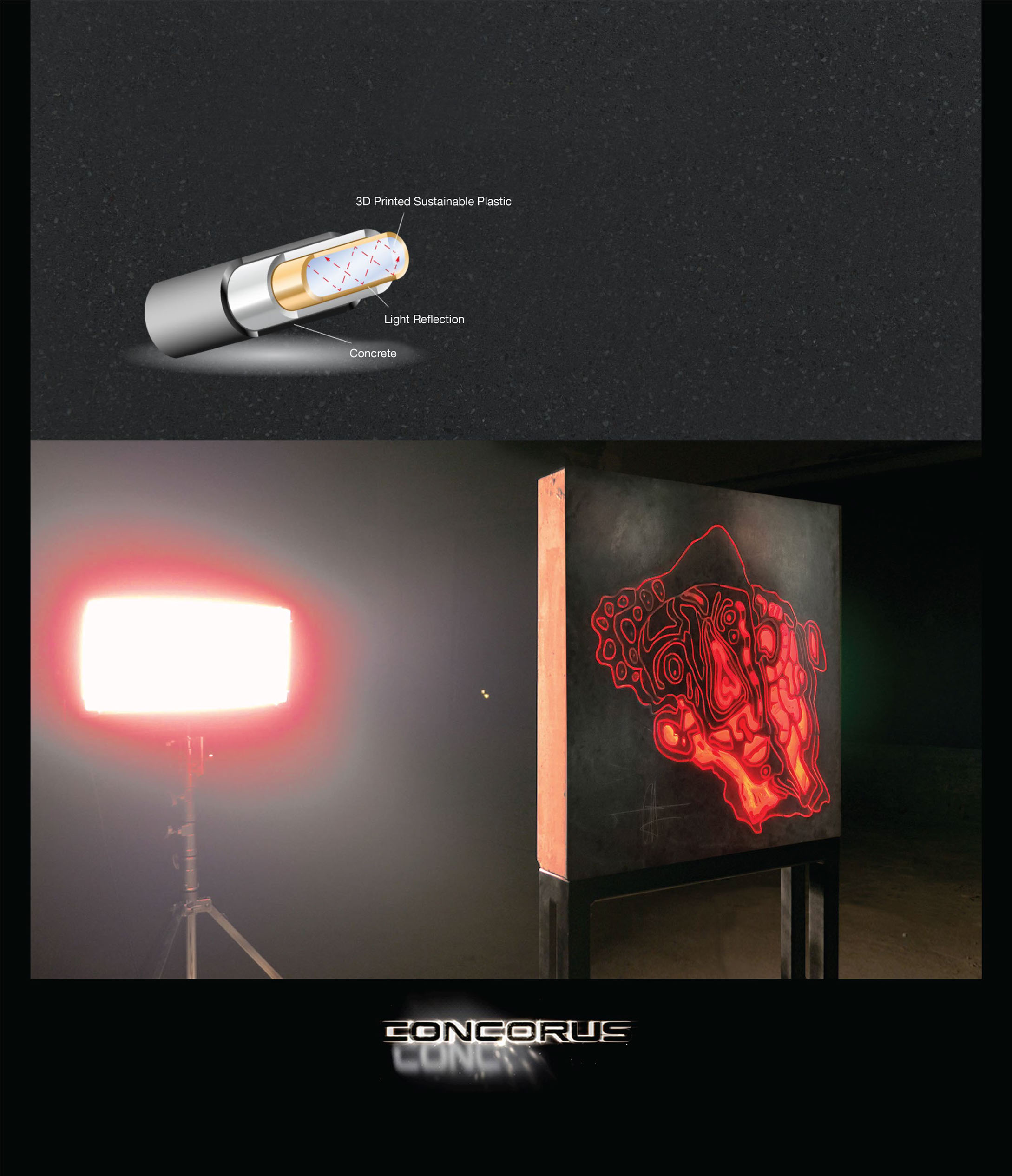 CONCORUS is a precast concrete product. In a special process 3D printed sustainable plastics are inserted in a fine-grain concrete. Due to the relatively low portion of 3D printed plastic, the solidity and consistency of the light transmitting concrete is almost equivalent to high-strength concretes.